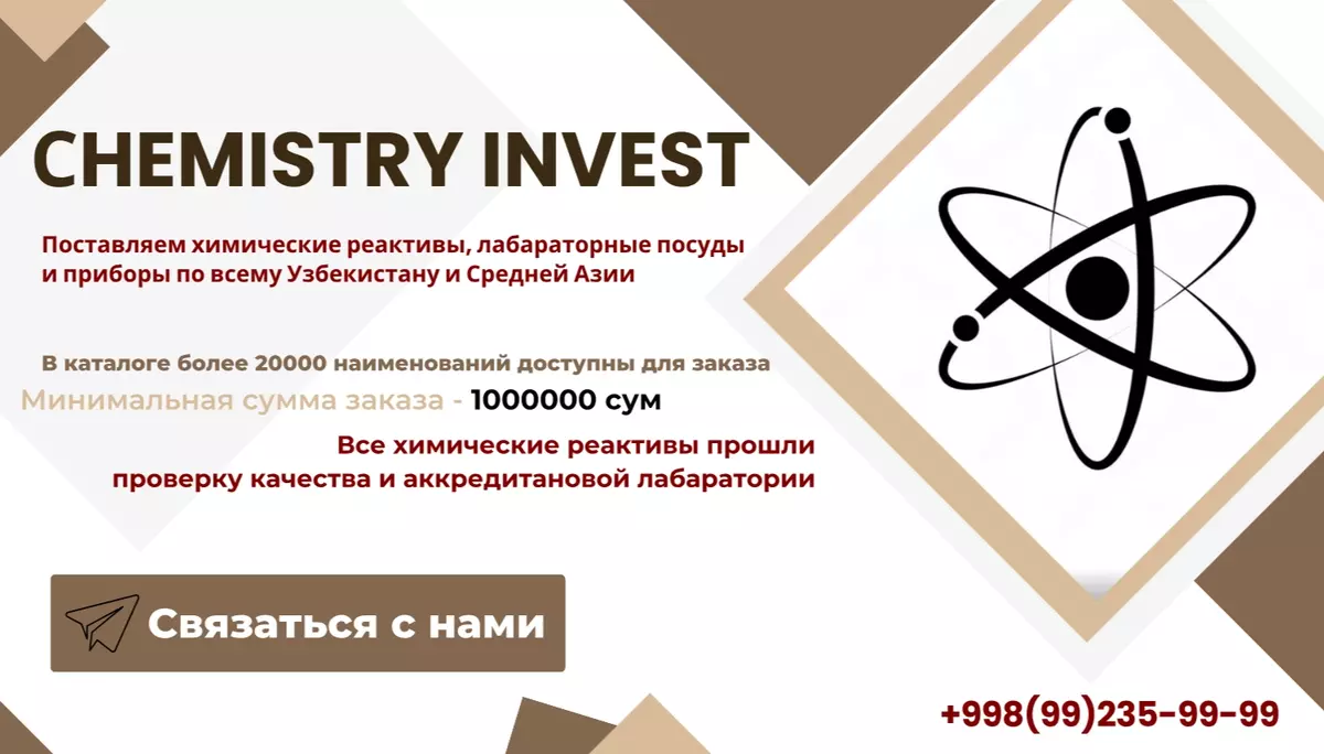 Keng assortiment Bizning omborlarimizda 20 000 dan ortiq turdagi import kimyoviy reaktivlar mavjud: kislotalar, erituvchilar, indikatorlar, elektrolitlar, ishqorlar, tuzlar va laboratoriya hamda sanoat sohalarida qo‘llaniladigan boshqa moddalar. Shuningdek, laboratoriya asbob-uskunalari va idish-tovoqlari ham mavjud. Qulay qadoqlash Mahsulotlarimizni turli hajmdagi shisha va polietilen idishlarga qadoqlaymiz. Mijozning idishiga qadoqlash imkoniyati ham mavjud. Tovarlar maxsus qutilar va yashiklarga joylanadi, bu esa tashish vaqtida yukning butunligini saqlab qolishga yordam beradi.
